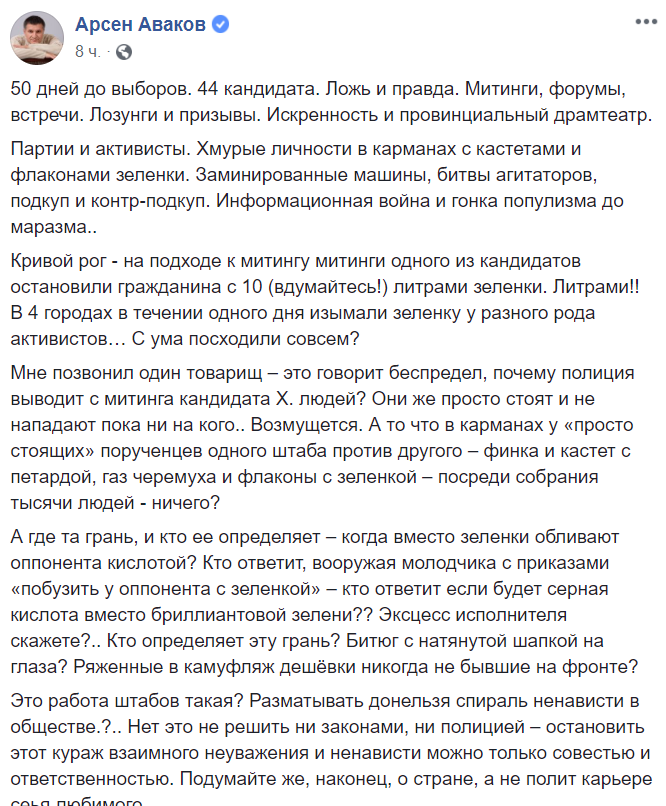 "Кривой Рог - на подходе к митингу митинги одного из кандидатов остановили гражданина с 10 (вдумайтесь!) литрами зеленки. Литрами! В 4 городах в течении одного дня изымали зеленку у разного рода активистов… С ума посходили совсем?