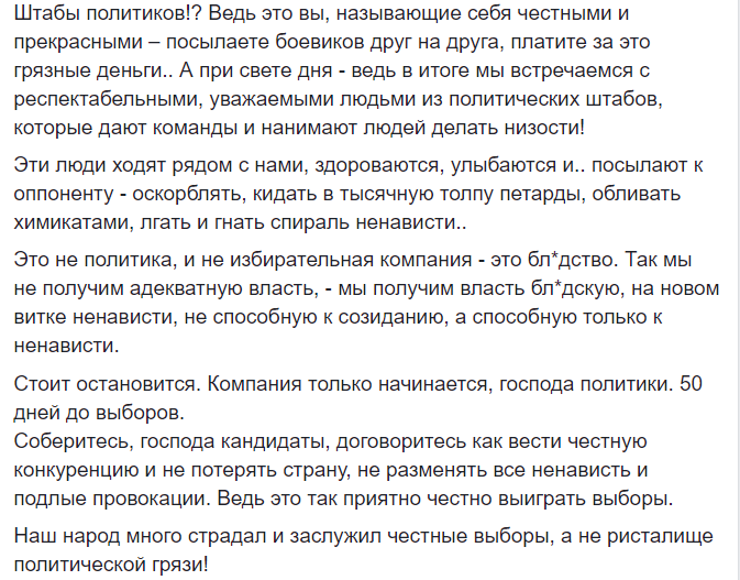 Он сделал вывод, что "это не политика, и не избирательная компания - это бл*дство. Так мы не получим адекватную власть, - мы получим власть бл*дскую, на новом витке ненависти, не способную к созиданию, а способную только к ненависти".