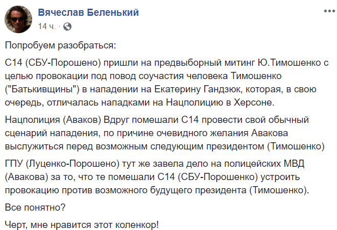 "С14 (СБУ-Порошено) пришли на предвыборный митинг Ю.Тимошенко с целью провокации под повод соучастия человека Тимошенко ("Батькивщины") в нападении на Екатерину Гандзюк, которая, в свою очередь, отличалась нападками на Нацполицию в Херсоне.