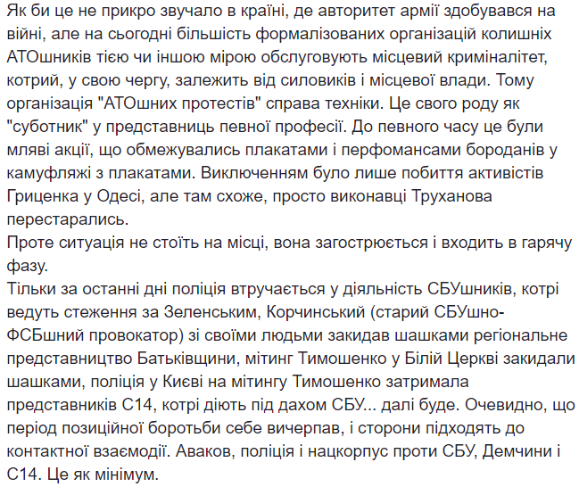 Как бы это ни прискорбно звучало в стране, где авторитет армии приобретался на войне, но сегодня большинство формализованных организаций бывших АТОшников в той или иной степени обслуживают местный криминалитет, который, в свою очередь, зависит от силовиков и власти. Поэтому организация "АТОшных протестов" дело техники.