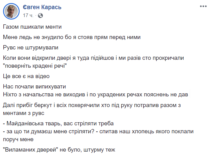 Нас начали выпихивать. Никто из начальства не выходил и по украденным вещам объяснений не дал. Далее прибежал беркут и всех пох...рячили, кто под руку попал, вместе с ментами из РУВД", - рассказал глава С14.