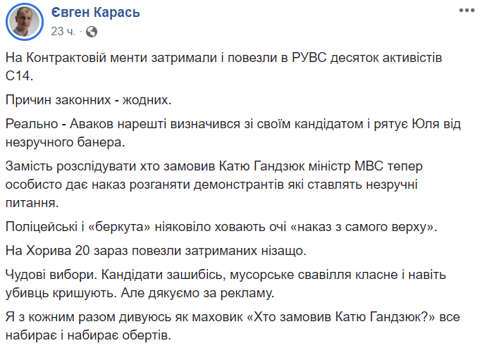 Вместо расследования, кто заказал Катю Гандзюк, министр МВД теперь лично дает приказ разгонять демонстрантов, которые задают неудобные вопросы", - написал националист в Facebook.