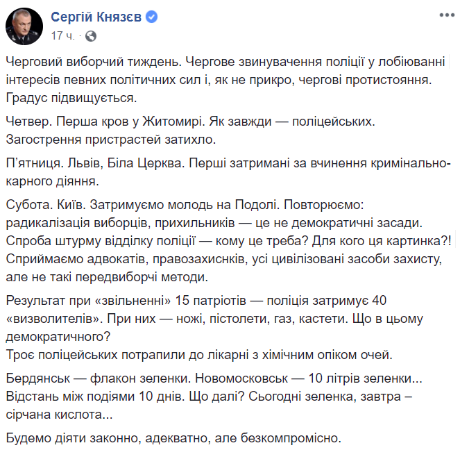 Еще раньше похожий пост написал глава Нацполиции Сергей Князев, который также отметил обострение столкновений. Он вспомнил недавнюю попытку нападения на митинг Тимошенко в Белой Церкви.