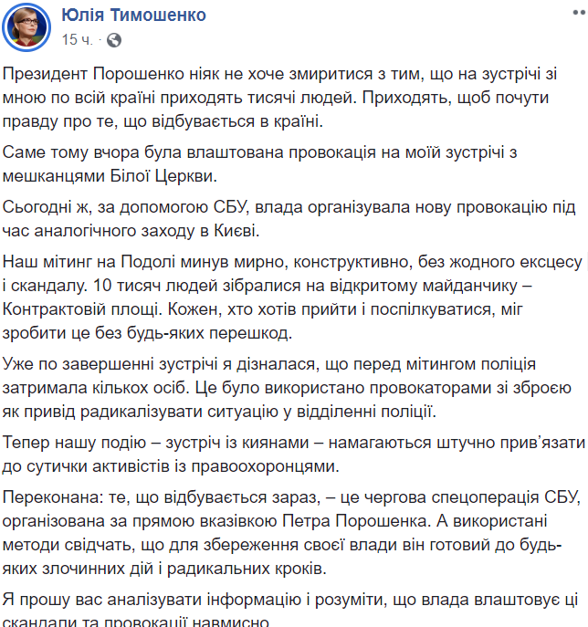Я прошу вас анализировать информацию и понимать, что власть устраивает эти скандалы и провокации намеренно", - написала ЮВТ в Facebook.