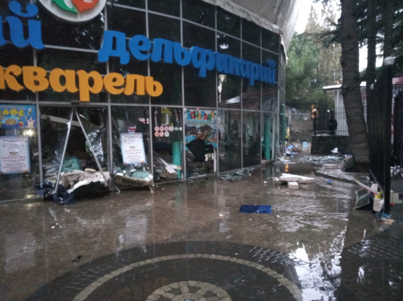 Из-за ЧП вода со стеклами и зрительскими креслами оказалась на улице. Спасателям пришлось срочно эвакуировать двух дельфинов.