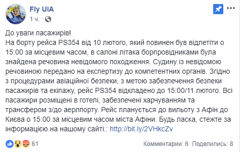 "На борту рейса PS354 от 10 февраля, который должен был улететь в 15:00 по местному времени, в салоне самолета бортпроводниками было найдено вещество неизвестного происхождения. Сосуд с неизвестным веществом передан на экспертизу в компетентные органы. В соответствии с процедурами авиационной безопасности, в целях обеспечения безопасности пассажиров и экипажа, рейс PS354 отложен до 15.00 11 февраля", – говорится в сообщении.