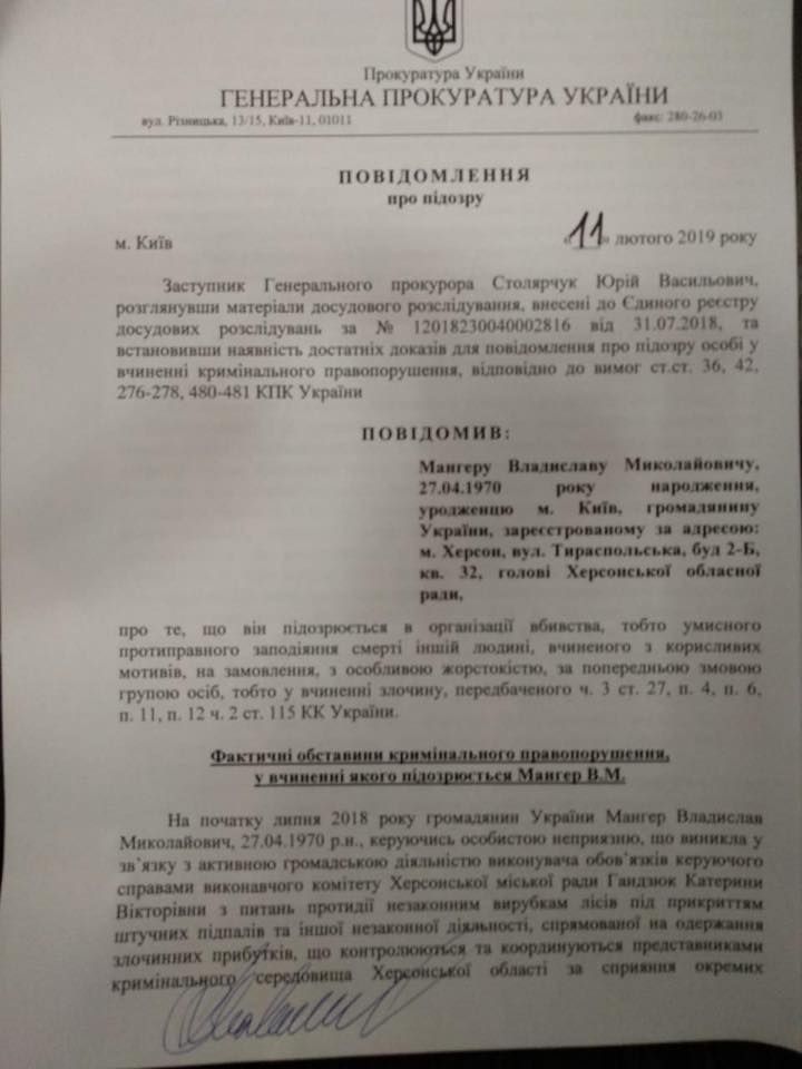 Подозрение лично привез в Херсон в 08:20 заместитель генпрокурора Юрий Столярчук. В ней говорится организацию преступления, предусмотренного ч. 3 ст. 27, П.4, п.6, п.11, п. 12 ч. 2 ст.115 УК Украины. То есть то есть умышленного противоправного причинения смерти другому человеку, совершенного из корыстных мотивов, на заказ, с особой жестокостью, по предварительному сговору группой лиц.