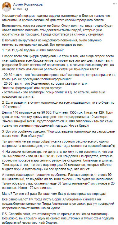 UPD: по старому порядку горсовет выдавал помощь любому жителю Украины, а не ток Днепра", - пишет блогер Денис Селин.