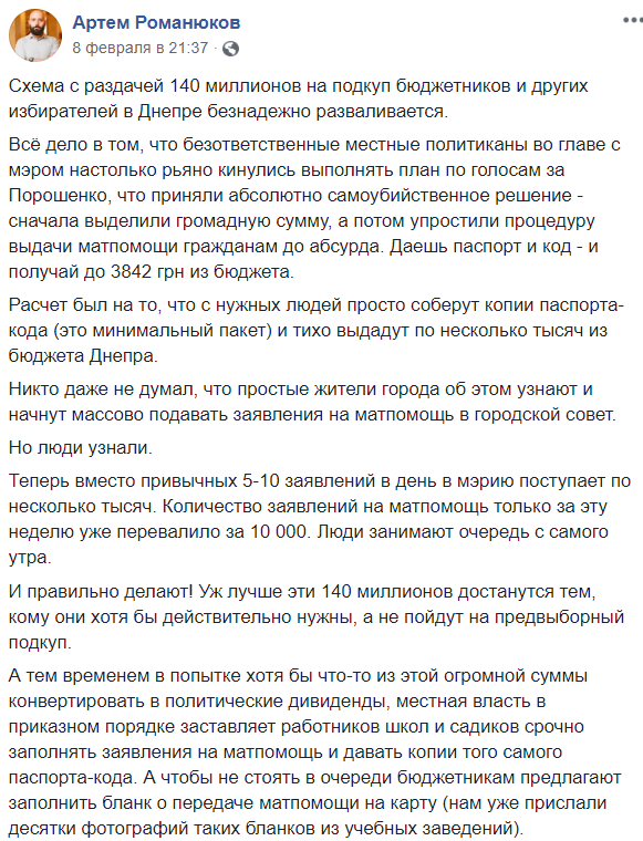 "Схема с раздачей 140 миллионов на подкуп бюджетников и других избирателей в Днепре безнадежно разваливается.