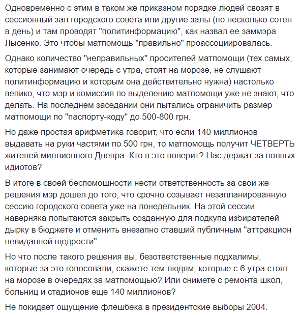 Но что после такого решения вы, безответственные подхалимы, которые за это голосовали, скажете тем людям, которые с 6 утра стоят на морозе в очередях за матпомощью? Или снимете с ремонта школ, больниц и стадионов еще 140 миллионов?