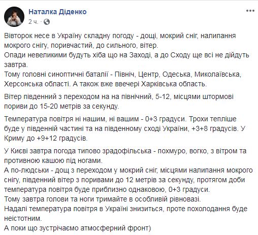 Во вторник, 12 февраля, в Украине ожидаются сложные погодные условия - дожди, мокрый снег, налипание мокрого снега, сильный порывистый ветер. Об этом сообщила синоптик Наталья Диденко на странице в Facebook.