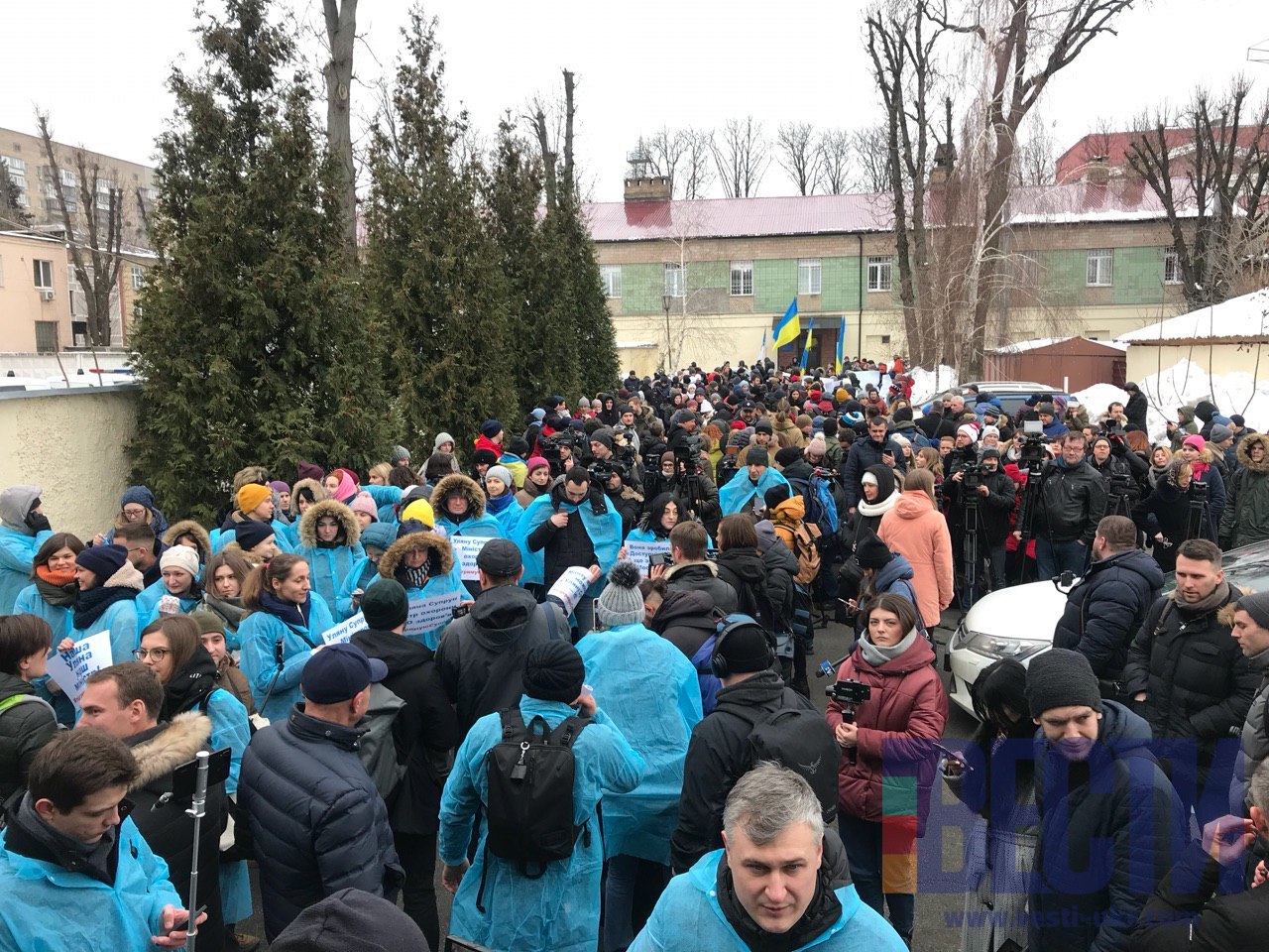 Около 13:00 под судом собрались люди в поддержку МОЗ и трансформации системы здравоохранения. Здесь выступили, как сторонники, так и противники Ульяны Супрун. Здесь же находится и заместитель министра экономического развития Максим Нефедов. Он держит в руках плакат "Руки геть від Супрун".