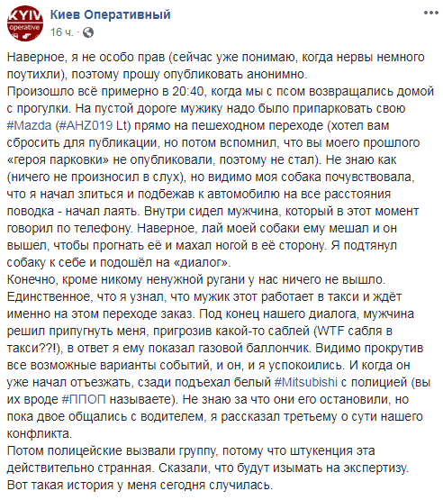 "Я подтянул собаку к себе и подошёл на "диалог". Конечно, кроме никому ненужной ругани у нас ничего не вышло. Единственное, что я узнал, что мужик этот работает в такси и ждёт именно на этом переходе заказ. Под конец нашего диалога, мужчина решил припугнуть меня, пригрозив какой-то саблей (WTF сабля в такси??!), в ответ я ему показал газовой баллончик.