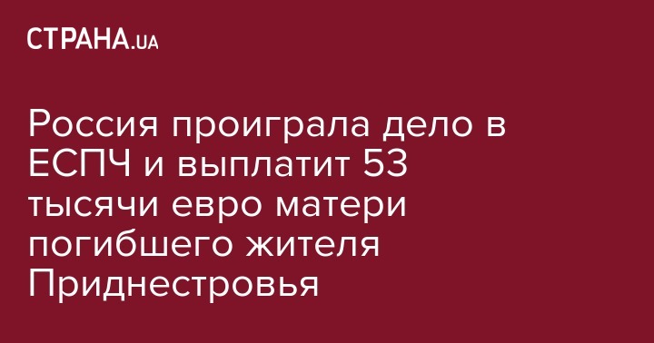 Европейский суд по правам человека (ЕСПЧ) обязал Россию выплатить 53 тысячи евро по иску о  нарушении права на жизнь в непризнанном Приднестровье. Об этом сообщает "Укринформ", ссылаясь на правозащитную Ассоциацию Promo-LEX.