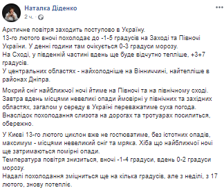 "Арктический воздух постепенно заходит в Украину. 13 февраля ночью похолодает до -1-5 градусов на западе и севере Украины. В дневные часы там ожидается 0-3 градуса мороза. На Востоке, в южной части днем еще будет ощутимо теплее, до +3...+7 градусов. В центральных областях - холоднее всего на Винниччине, а теплее всего в районах Днепра", - написала Наталья Диденко.