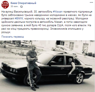 Как сообщает "Киев Оперативный" в соцсети, автомобиль Nissan частного предпринимателя был заблокирован тремя неизвестными молодыми людьми в масках. Налетчики несколько раз выстрелили в машину бизнесмена и отобрали у него сумку, в которой находилось 40 тысяч долларов.