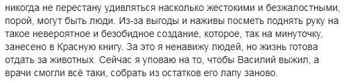 "Местные охранники, которые знают его уже давно, заметили, что бобер не появлялся на протяжении 2-х дней. А в понедельник обнаружили его в капкане", - рассказала Полиха. По словам спасательницы, "всевозможные службы" отказывали охранник в помощи, пока они не нашли контакты организации.