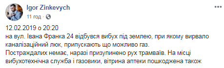 "На улице Ивана Франко 24 произошел взрыв под землей, которым вырвало канализационный люк. Пострадавших нет, пока приостановлено движение трамваев. На месте работает взрывотехническая служба и газовики, витрина аптеки повреждена также", - написал Зинкевич и выложил фото последствий инцидента.