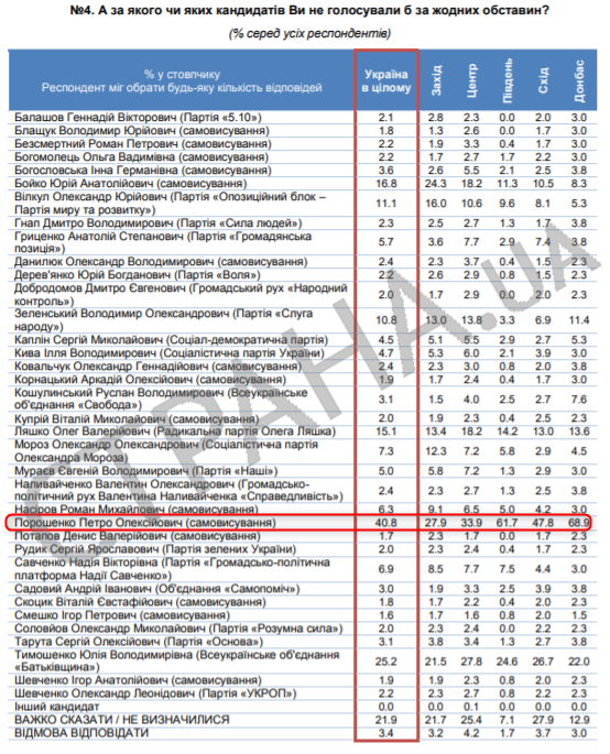 При этом, у Петра Порошенко сохраняется самый большой антирейтинг - 40% опрошенных не проголосовали бы за него ни при каких обстоятельствах.