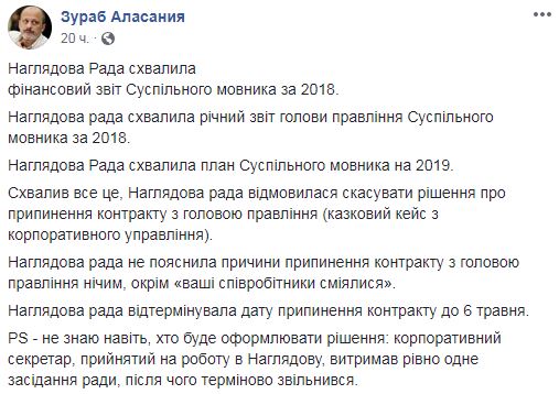 Напомним, 12 февраля набсовет ПАО "НОТУ" решил отложить решение о расторжении контракта с председателем правления НОТУ Зурабом Аласанией до 6 мая. Как рассказала в комментарии hromadske.ua и.о. председателя наблюдательного совета НОТУ Светлана Остапа, с главой Общественного Аласанией решили расторгнуть контракт с 6 мая 2019 года, чтобы его увольнение не связывали с президентскими выборами в Украине. Как сообщается, 11 членов набсовета проголосовали "за", а 4 требовали полной отмены решения об увольнении.