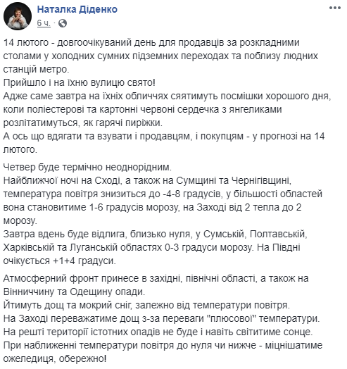 Погода в Украине в День всех влюбленных отметится температурными колебаниями - ночью на востоке, а также в Сумской и Черниговской области температура снизится до минус 8 градусов, а на западе страны тем временем будет до 2 градусов тепла. На большую часть территории Украины придут снег с дождем. Об этом в своем Facebook сообщила синоптик Наталья Диденко.