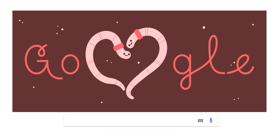 Сегодня, 14 февраля ко Дню Святого Валентина, покровителя всех влюбленных Google представил романтический дудл. Видео начинается с двух розовых червяков, складывающихся в сердце.