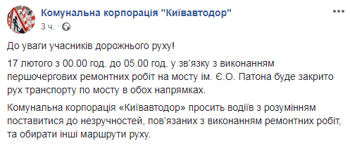 "Киевавтодор" обратился к столичным водителям с просьбой отнестись к этому обстоятельству с пониманием и выбрать в указанное время другие маршруты, которые не будут проходить через мост Патона.