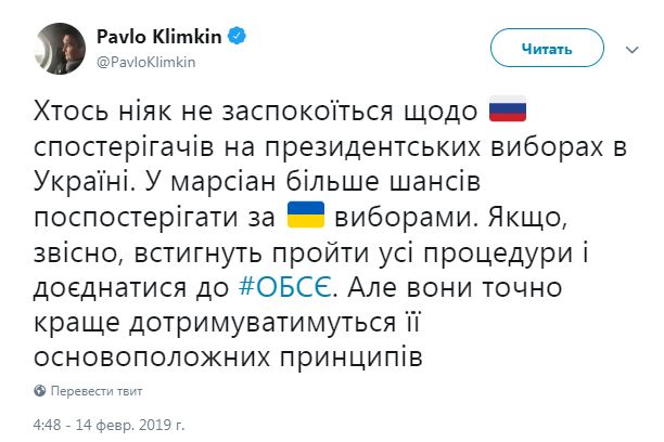 Министр иностранных дел Украины Павел Климкин заявил, что больше шансов быть наблюдателями на президентских выборах в Украине у марсиан, чем у россиян. Об этом он написал в Twitter.