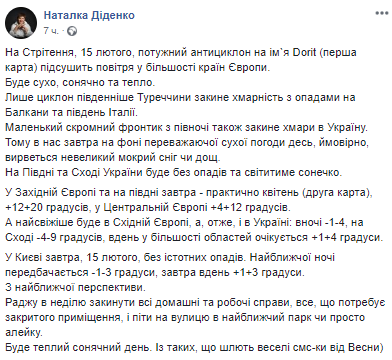 На Сретение, 15 февраля, мощный антициклон Dorit  подсушит воздух в большинстве стран Европы. Погода будет сухой, солнечной и теплой. Об этом на своей странице в соцсети пишет синоптик Наталья Диденко.