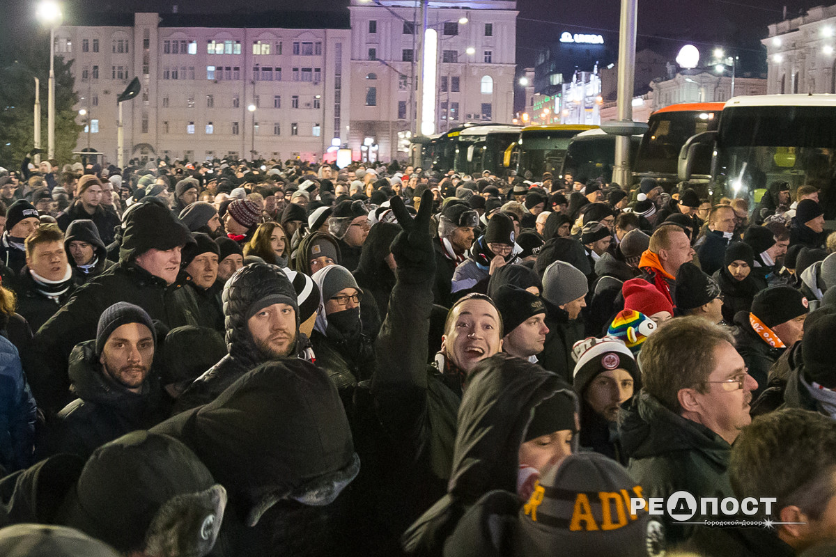 На матч в Харькове прилетели около 2700 немецких фанатов. Их сопровождают немецкие полицейские, стюарды, сотрудники клуба по работе с болельщиками. Также прибыл специальный офицер безопасности УЕФА. Делается это из соображений безопасности. На прошлом выездном еврокубковом матче "Айнтрахта" в Риме его фанаты устроили потасовки с болельщиками "Лацио". После этого в УЕФА решили дать "Айнтрахту" испытательный срок в два года. Если за это время повторится что-то подобное, то до конца этого периода все выездные матчи клуба будут проходить без болельщиков.
