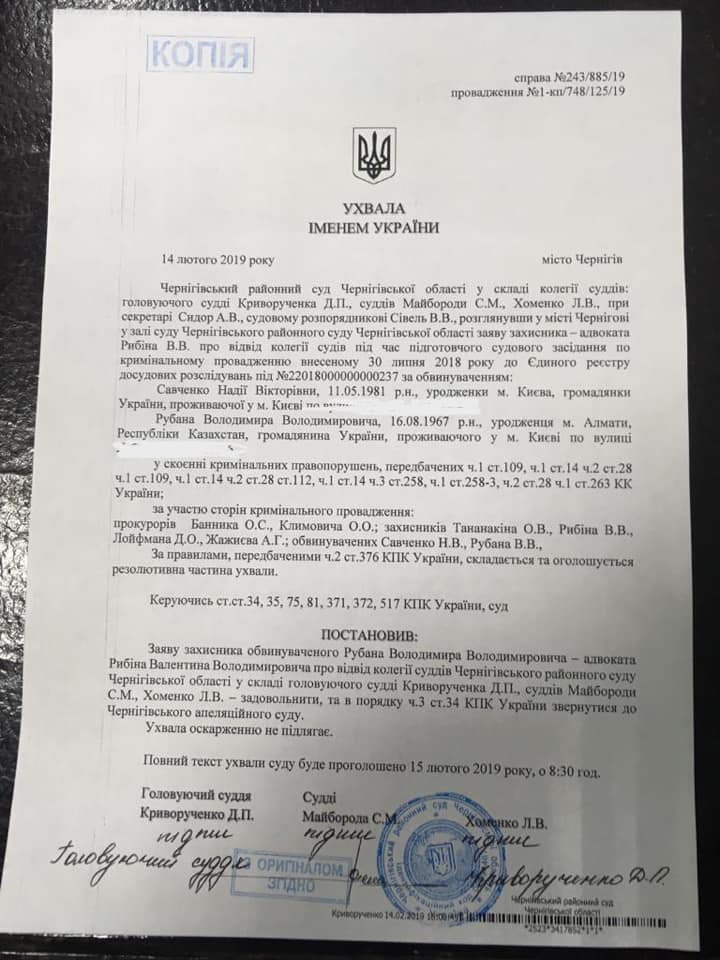 Коллегия судей удовлетворила отвод всех судей Черниговского суда по делу Савченко и Рубана. Документ