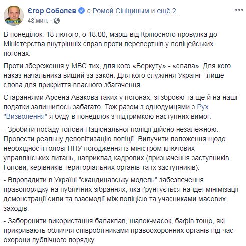 В понедельник, 18 февраля, в Киеве состоится марш "против оборотней в полицейских погонах" и "тех сотрудников МВД, для кого "Беркуту" - слава". Об этом сообщил в Facebook народный депутат Украины от фракции "Самопомощь" Егор Соболев.