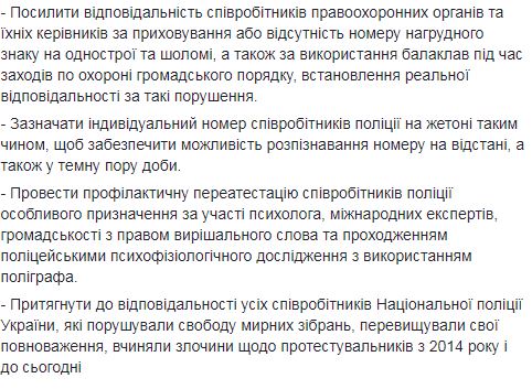 7. Привлечь к ответственности всех сотрудников Национальной полиции Украины, которые нарушали свободу мирных собраний, превышали свои полномочия, совершали преступления в отношении протестующих с 2014 года и до сегодня