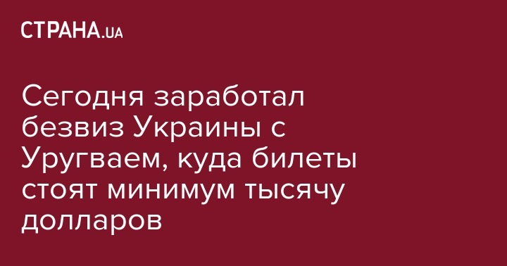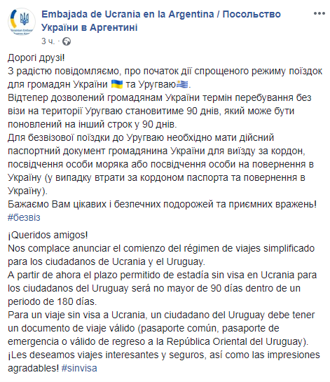 В пятницу, 15 февраля, начал действовать безвизовый режим с Уругваем для украинцев. Об этом сообщает посольство Украины в Аргентине на своей странице в Facebook.