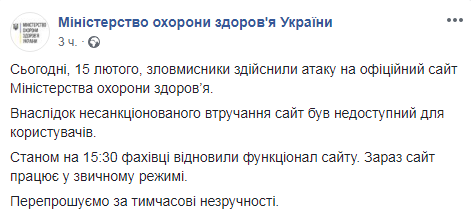 В пятницу, 15 февраля, Министерство здравоохранения Украины пожаловалась на хакерскую атаку на свой официальный сайт. Сообщение об этом ведомство опубликовало в Facebook.
