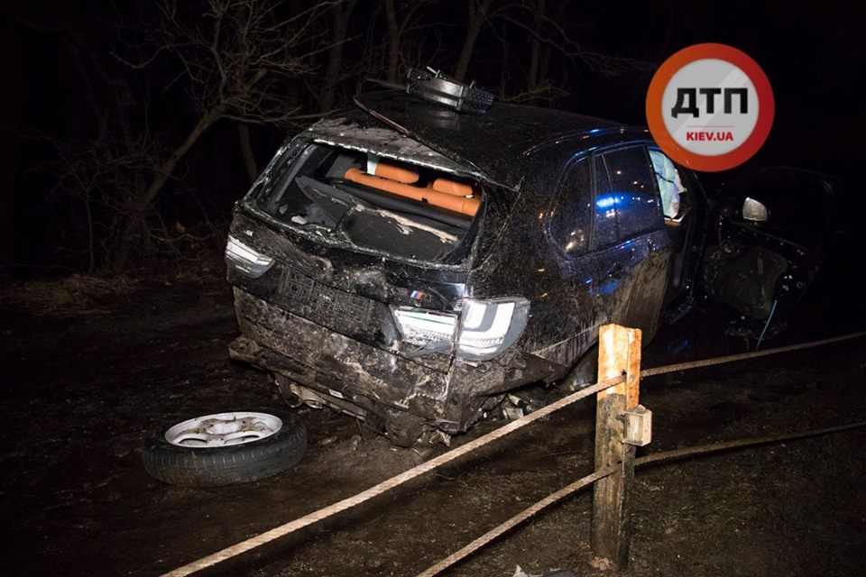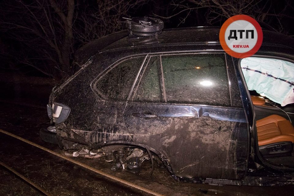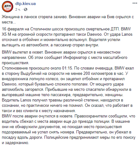 Сообщается, что внедорожник BMW X5 на огромной скорости влетел в отбойник, далее с оторванным колесом проехал около ста метров и слетел с дороги, протаранив попутный Daewoo Lanos. От такого сильного удара машина загорелась.
