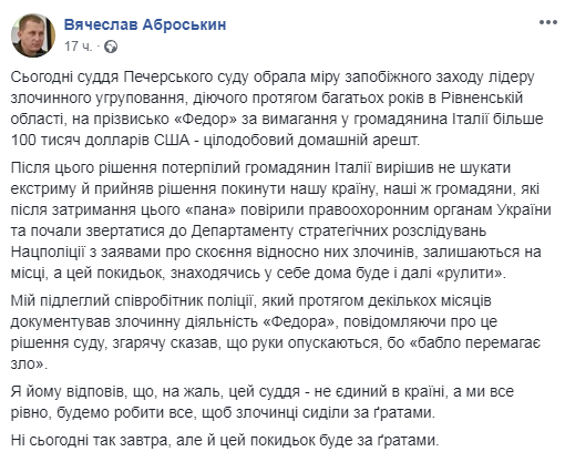 В пятницу, 15 февраля, Печерский районный суд Киева избрал ровенскому криминальному авторитету по прозвищу "Федор", которого подозревают в вымогательстве, меру пресечения в виде круглосуточного домашнего ареста. Об этом сообщил первый заместитель главы Национальной полиции Вячеслав Аброськин на своей странице в Facebook.