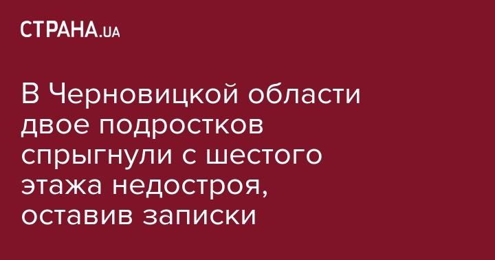 В субботу, 16 февраля, два подростка выпрыгнули с шестого этажа недостроенного здания в городе Сторожинец Черновицкой области. Полицейские обнаружили ребят с телесным повреждениями характерными для падения с высоты около 10:00. Один из парней был без признаков жизни. Другой находился без сознания. Об этом сообщает пресс-служба Черновицкой области.