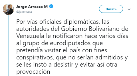 В свою очередь, глава МИД Венесуэлы Хорхе Арреаса заявил, что депутатам за несколько дней до поездки по дипломатическим каналам направили предупреждение о запрете въезда. Парламентариев с "заговорщическими мотивами" "настоятельно призвали воздержаться от поездки и избежать провокаций", написал Арреаса в своем микроблоге Twitter.