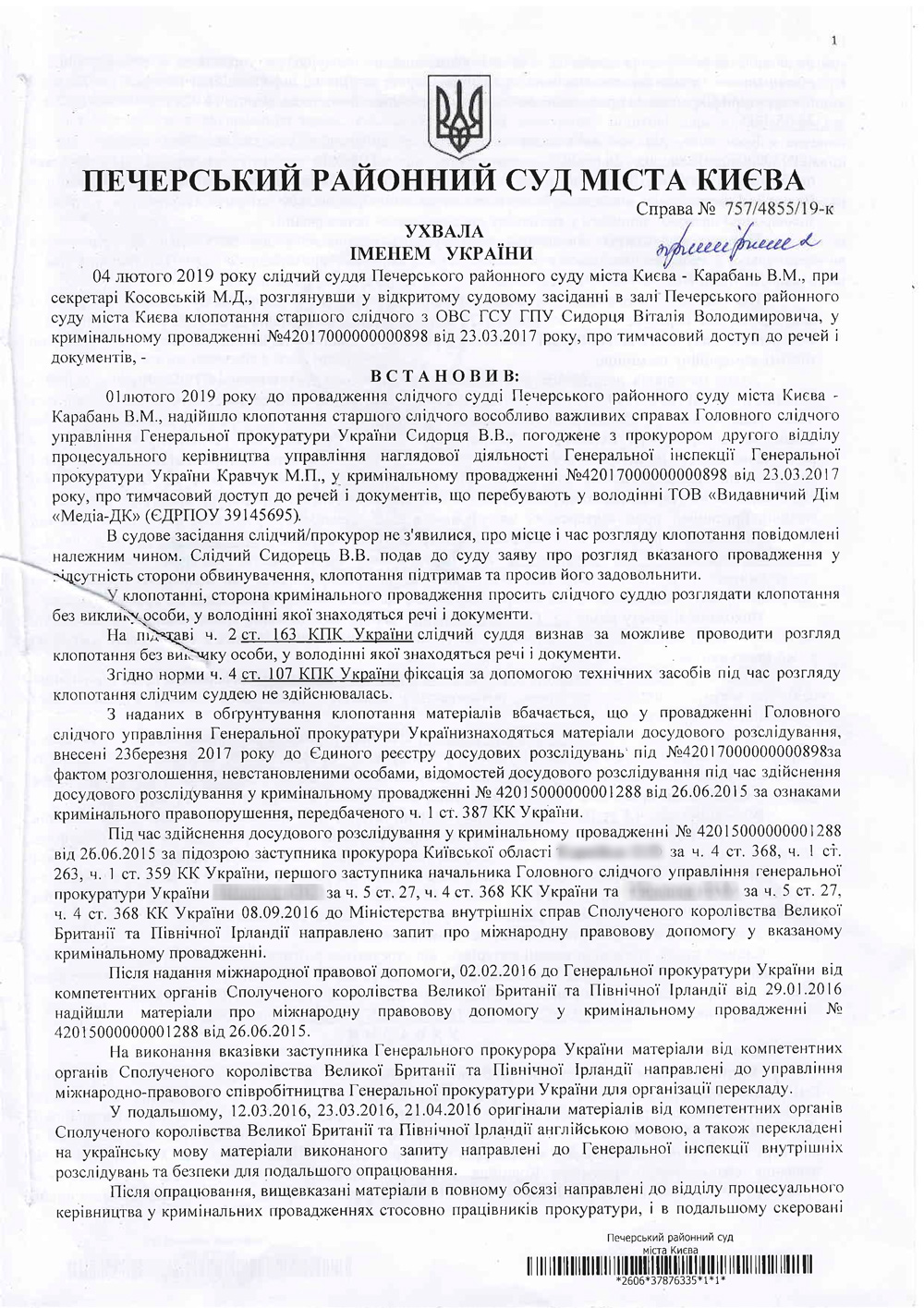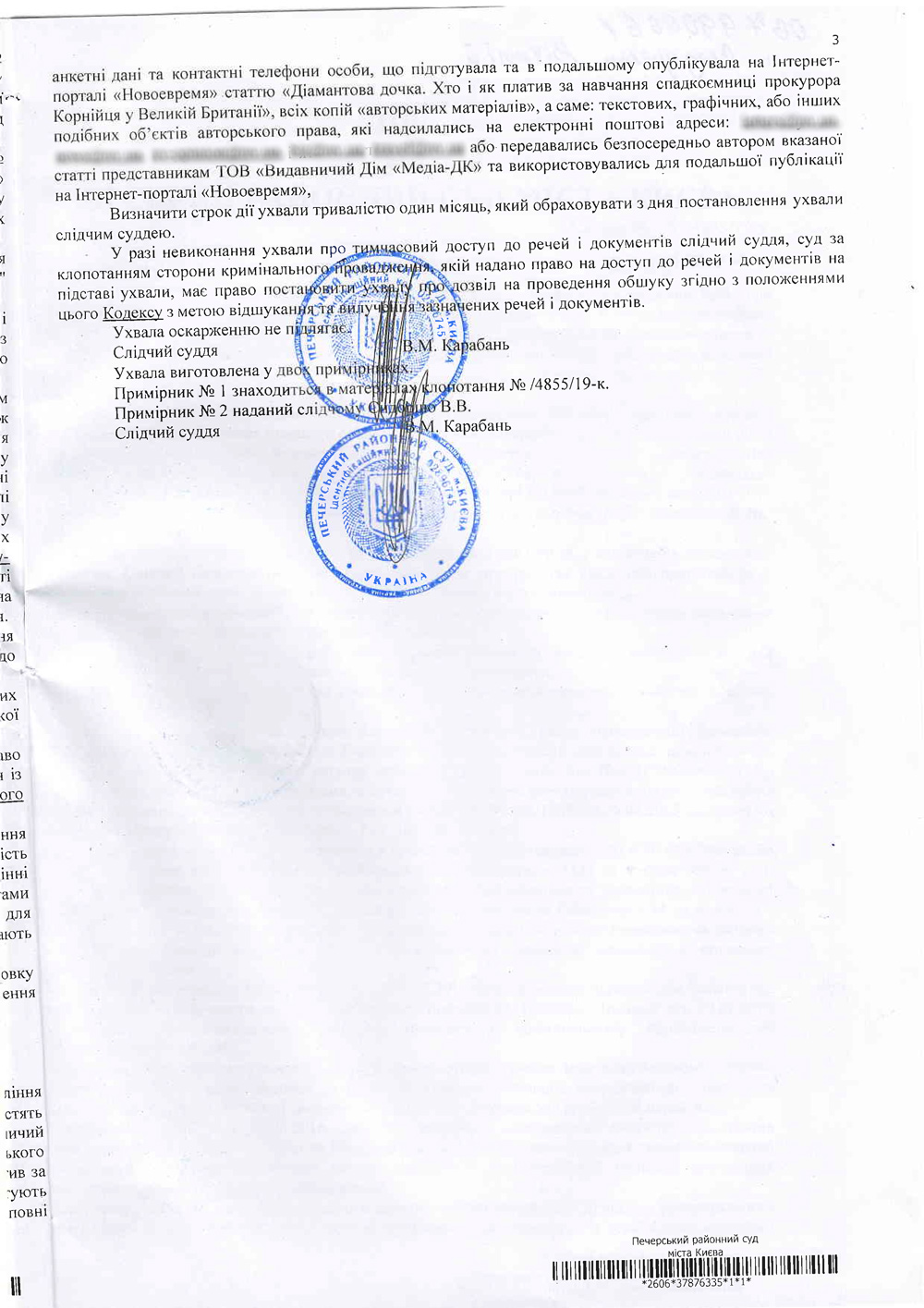 Две недели назад, 4 февраля судья Печерского райсуда Киева Владимир Карабань отдельным постановлением предоставил Генеральной прокуратуре доступ к внутренним документам редакции "Новое время" и ко всем материалам, которые посылал на электронный адрес издания его журналист Иван Верстюк. Об этом сообщает "Новое время", публикуя скан документа.