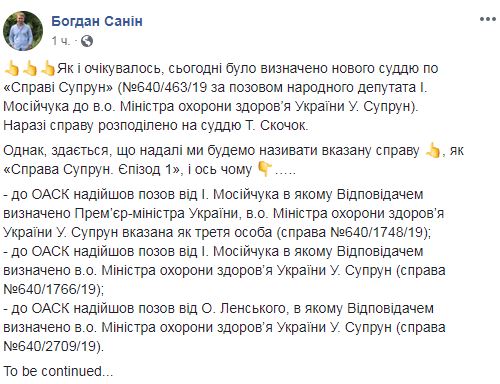 "Однако, кажется, что в дальнейшем мы будем называть дело, как "Дело Супрун. Эпизод 1", и вот почему ... В ОАСК поступил иск от И.Мосийчука, в котором ответчиком определен премьер-министр Украины Владимир Гройсман, а и.о. министра здравоохранения Украины У.Супрун указано в качестве третьего лица (дело №640/1748/19). В ОАСК поступил иск от И.Мосийчука, в котором ответчиком определена и.о. министра здравоохранения Украины У.Супрун (дело №640/1766/19). В ОАСК поступил иск от А.Ленского, в котором ответчиком определена и.о. министра здравоохранения Украины У.Супрун (дело №640/2709/19)", - написал он.