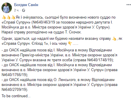 "В ОАСК поступил иск от И. Мосийчука, в котором ответчиком определен премъер-министр Украины, и. о. министра здравоохранения Украины У. Супрун указана как третье лицо (дело №640/1748/19)... В ОАСК поступил иск от И. Мосийчука, в котором ответчиком определена и. о. министра здравоохранения Украины У. Супрун (дело № 640/1766/19)", - пишет судья и добавляет, что из-за этого первый иск Мосийчука против Супрун стоит называть "Дело Супрун. Эпизод 1".