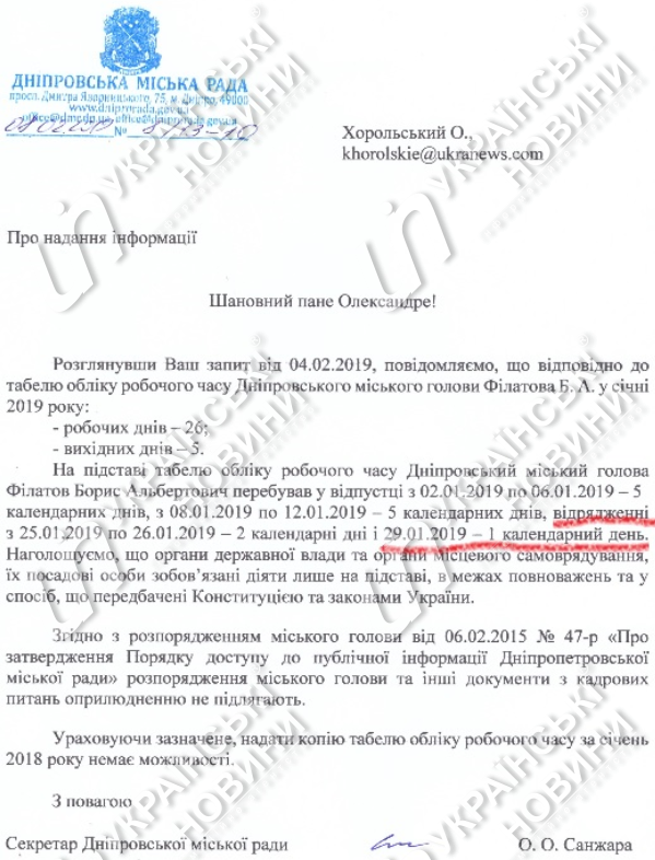 "В соответствии с табелем учета рабочего времени Днепровского городского головы в январе 2019 года … Филатов Борис Альбертович находился … в командировке … 29.01.2019 года – 1 календарный день".