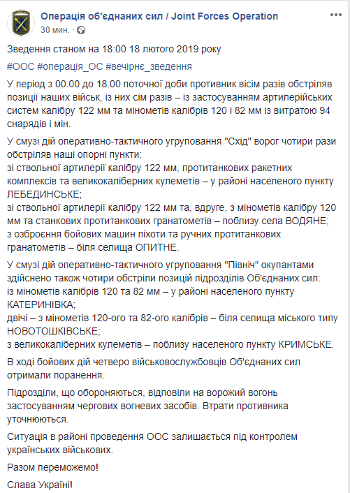 В понедельник, 18 февраля, четверо военнослужащих Объединенных сил были ранены на востоке Украины во время боевых действий. Об этом сообщается в сводке штаба с 00.00 до 18.00 текущих суток на странице пресс-центра ООС в социальной сети Facebook.
