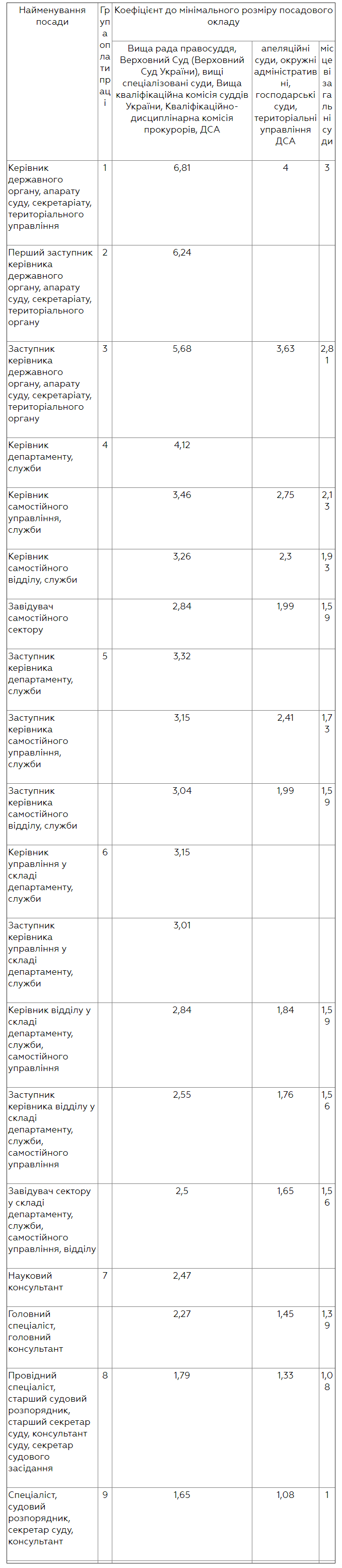 Для государственных служащих судов, органов и учреждений системы правосудия по группам оплаты труда утверждена такая схема должностных окладов с определением коэффициентов: