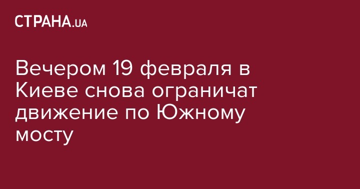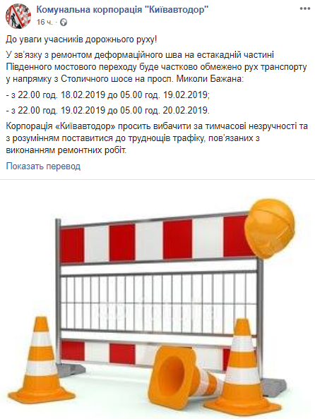 "В связи с ремонтом деформационного шва на эстакадной части Южного мостового перехода будет частично ограничено движение транспорта в направлении со Столичного шоссе на ул. Николая Бажана: с 22:00 18 февраля до 05:00 19 февраля; с 22:00 19 февраля до 05:00 20 февраля", - говорится в сообщении.