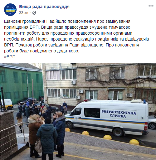 "Уважаемые граждане! Поступило сообщение о заминировании помещения ВСП. Высший совет правосудия вынужден временно прекратить работу для проведения правоохранительными органами необходимых действий. Сейчас проведена эвакуация работников и посетителей ВСП. Начало работы заседания Совета отложено. О возобновлении работы будет сообщено дополнительно", - сообщила пресс-служба ВСП.
