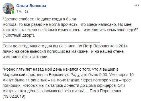 Журналистка Ольга Волкова процитировала на своей странице в Facebook историю президента, сопроводив ее цитатой из "Скотного двора". "Если до сегодняшнего дня вы не знали, но Петр Порошенко в 2014 лично на себе выносил погибших на майдане - и на нашей стене изменили текст истории", - резюмировала журналистка.