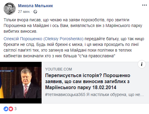 "Любой лжи есть предел, и эта граница проходит по линии светлой памяти тех, кто погиб на Майдане пока политики в теплых кабинетах определяли, кто из них больше "с@ка православная"", - написал он на своей странице в Facebook.