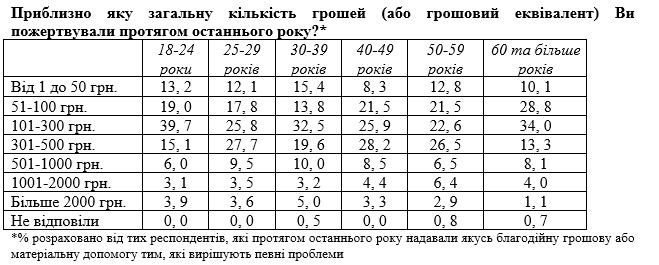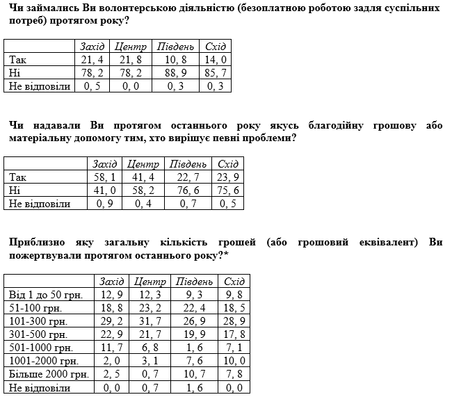 Сообщается, что на востоке и юге страны суммы пожертвований были выше: от 1000 и более 2000 гривен отдали по 19% опрошенных, а на западе и центре - 4% опрошенных. Также в прошлом году вырос процент тех, кто занимался волонтерской деятельностью - с 12% до 18%.